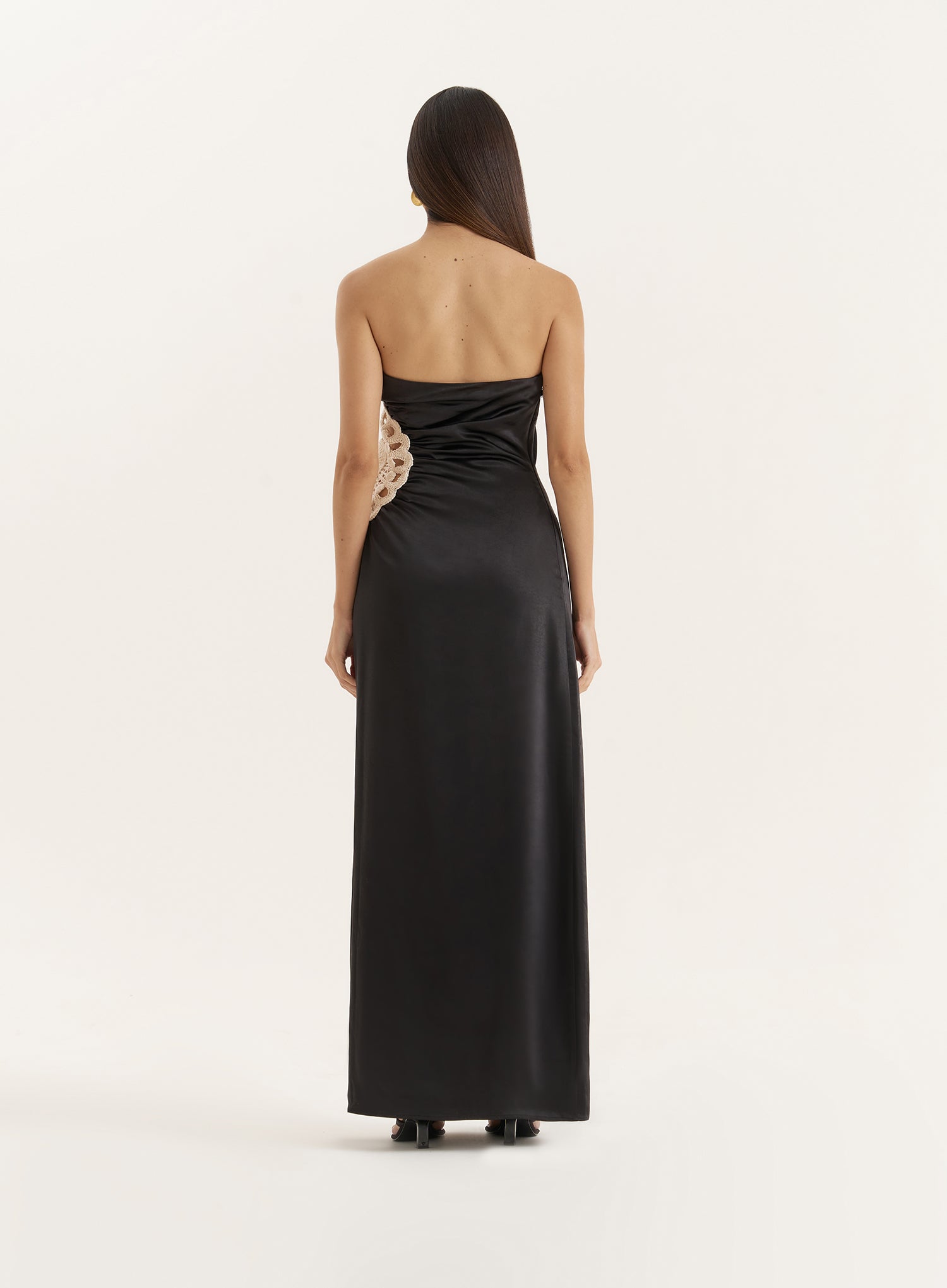 The ultimate holiday evening dress, the Cherry maxi dress features an elegant yet simple silhouette with a strapless bandeau neckline. Crafted from a soft satin in a staple black hue, it's elevated with a crochet cut out insert at the side with ruched detailing. We're envisioning summer events and golden hour drinks.