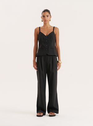 An elevated take on your summer staples, the black Banksie waistcoat top has a structured peplum style shape for an instantly flattering fit. Designed with thin straps and a v-neckline, it features a button-up front with pinched seams and pocket details for a tailored feel. Team it with the matching trousers for an everyday co-ord look - perfect for summer events and office days.