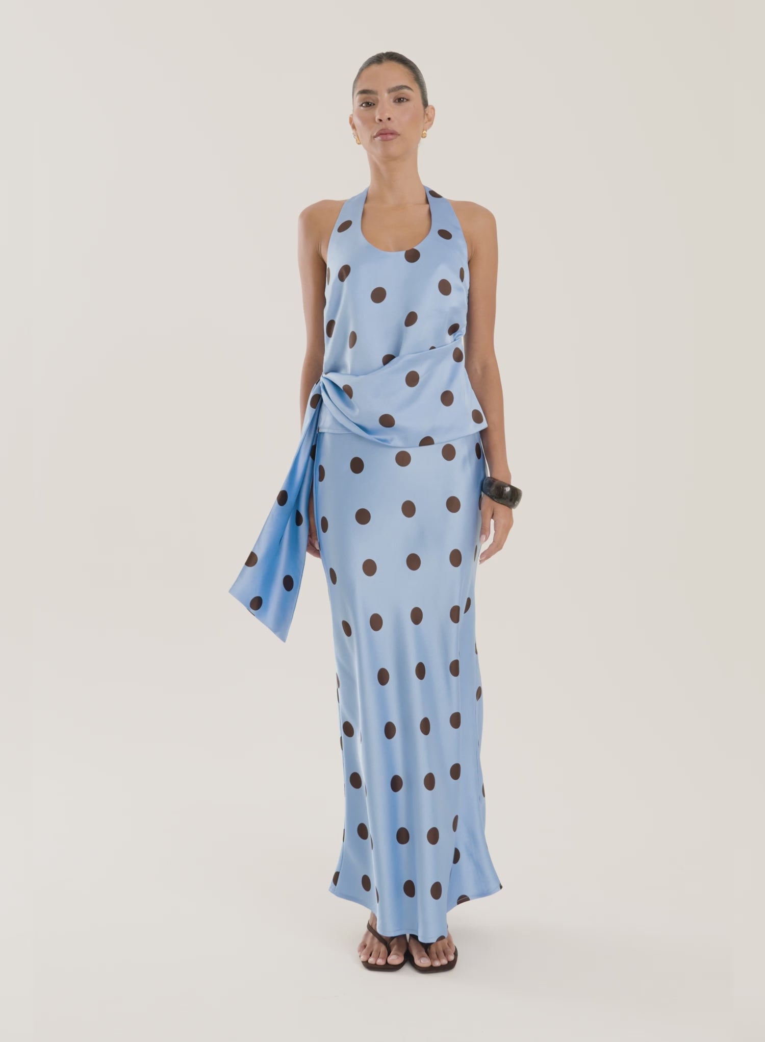Add a versatile touch to your summer occasion wardrobe with the Tobie satin skirt. Our classic maxi skirt silhouette is updated in a striking blue hue with a chocolate polka dot print. Featuring a high waisted fit with a zip up fastening, it can be styled with the matching Tobie top as a co-ord or reimagined with an everyday t-shirt for a casual summer feel.