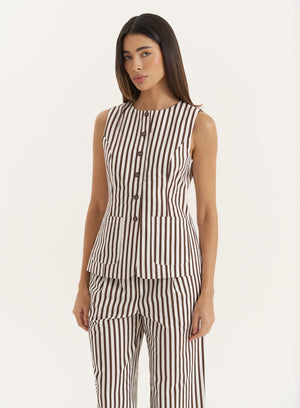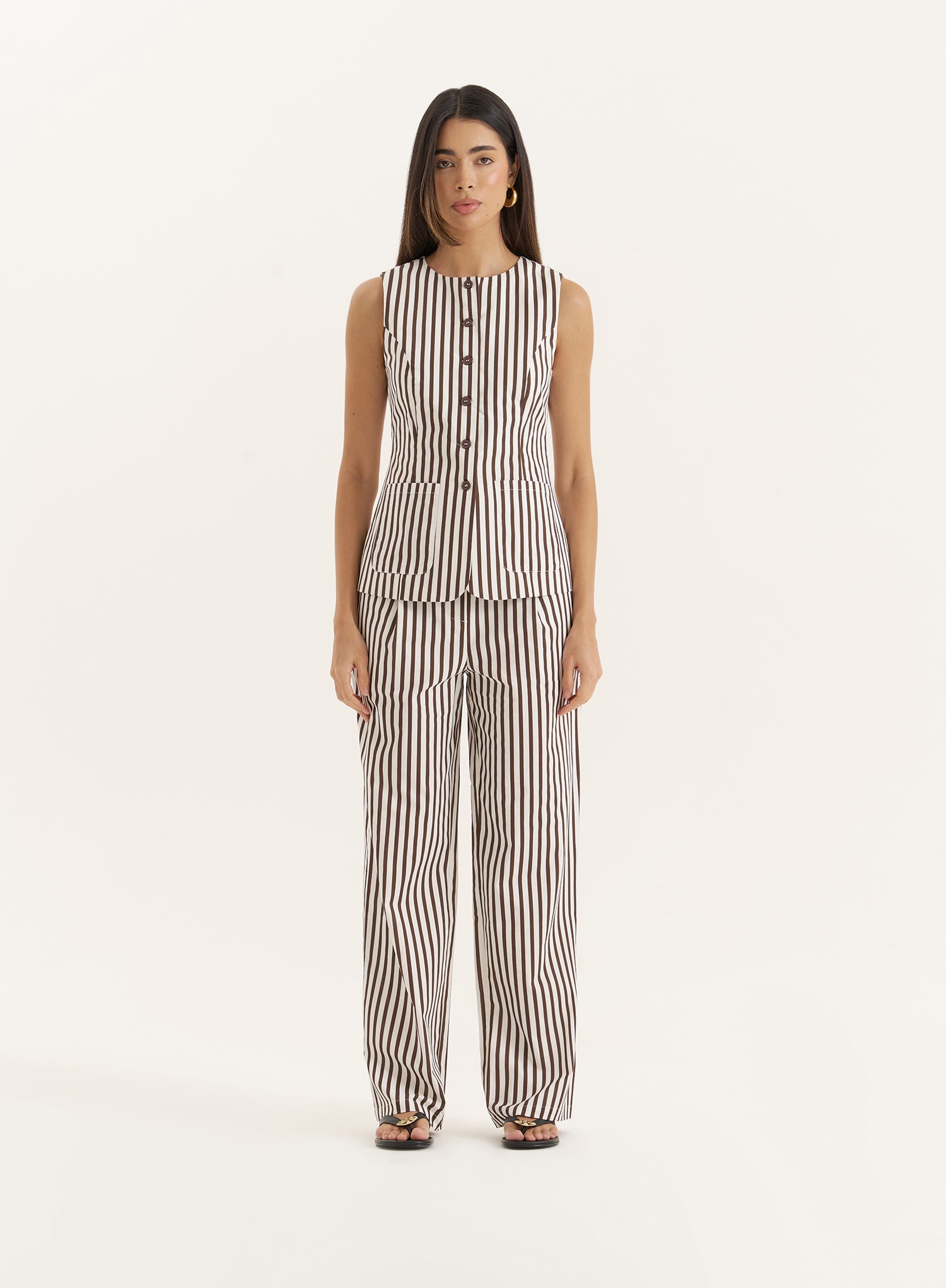 A summer stripe pant that will cover all occasions, the Lisa trousers come in a relaxed, straight leg shape. In a classic button up waist design, we love the retro-inspired brown and white stripe print. Wear with the matching waistcoat for a head-to-toe look that takes you from day to night.