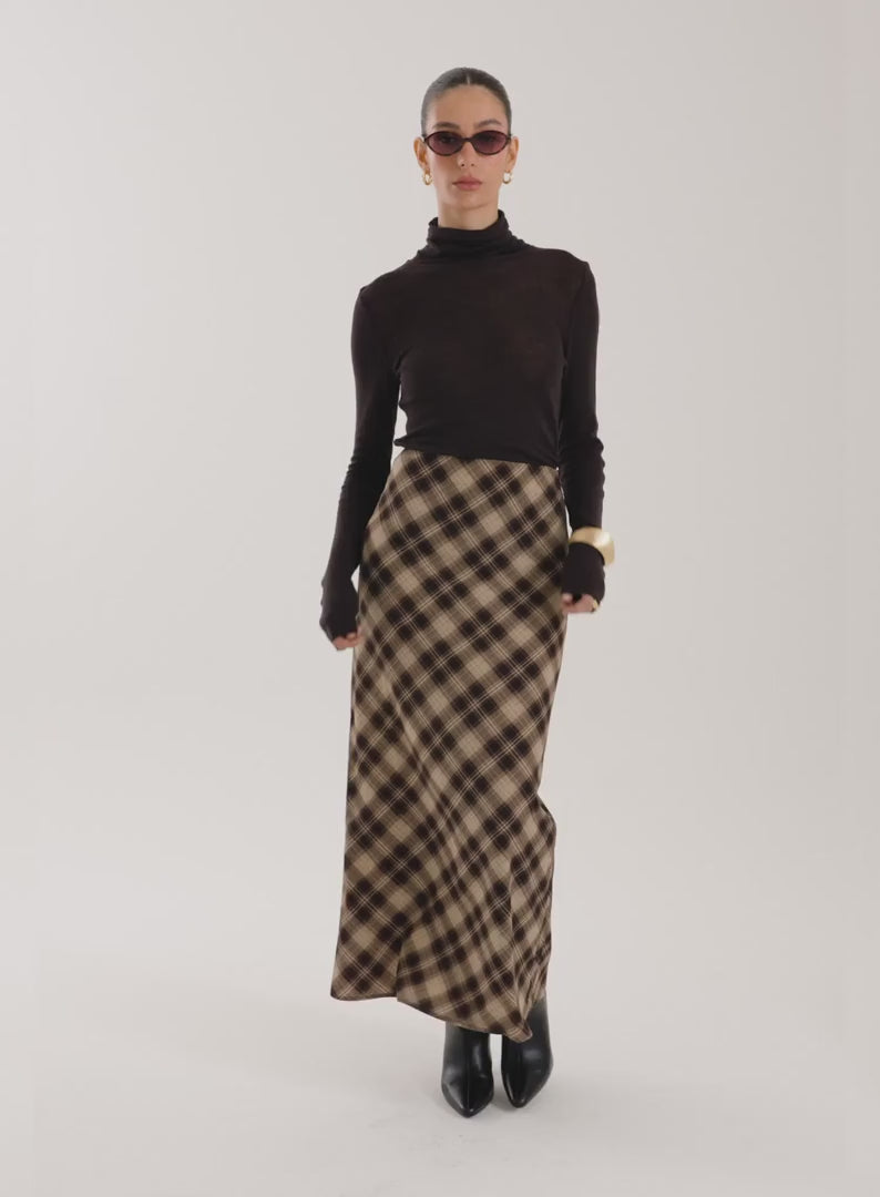 In a classic straight fit, the Nico maxi skirt combines a timeless design with a trending brown and beige check print. Crafted from a chiffon fabric, the high waisted shape creates a flattering fit. Designed with day to night dressing in mind, it pairs perfectly with heeled boots and light knitwear as we enter into spring season.