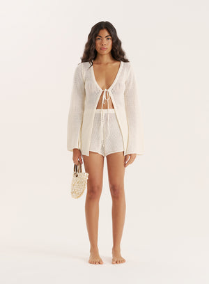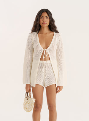 The summer essential you've been looking for, the cream Antoine tie front top comes in a breathable, open knit fabric - perfect for layering over your bikini. Featuring long sleeves with slightly flared hems, it can be tied at the front or left open for versatile styling. Wear with the matching Antoine shorts for a beach set of dreams.