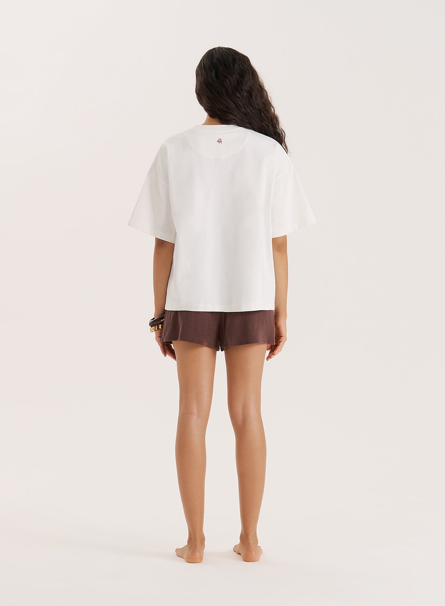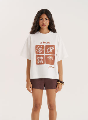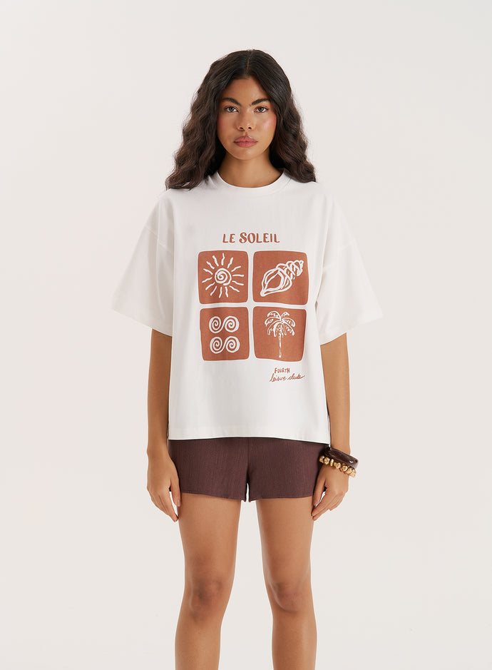 For casual summer moments, reach for the Ria oversized t-shirt. Crafted from a pure cotton fabric, it features a relaxed fit with dropped shoulders, short sleeves and a crew neckline. In a neutral off-white hue, it's finished with a rust 'Le Soleil' graphic print across the chest and 'Fourth leisure club' branding. Wear with striped beach shorts for an everyday holiday look.