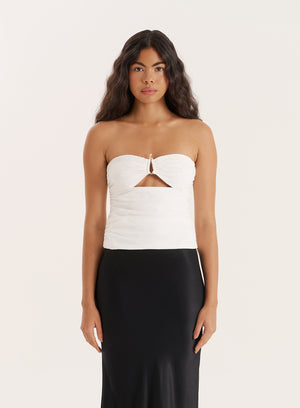 Designed with high summer in mind, the Sally white bandeau top is everything you need for dressier holiday moments. Crafted from a soft cotton, it features a cut out design with gold hardware detail. The strapless neckline and pleated finish create a super flattering fit - just pair with a simple satin skirt for a serene evening look.