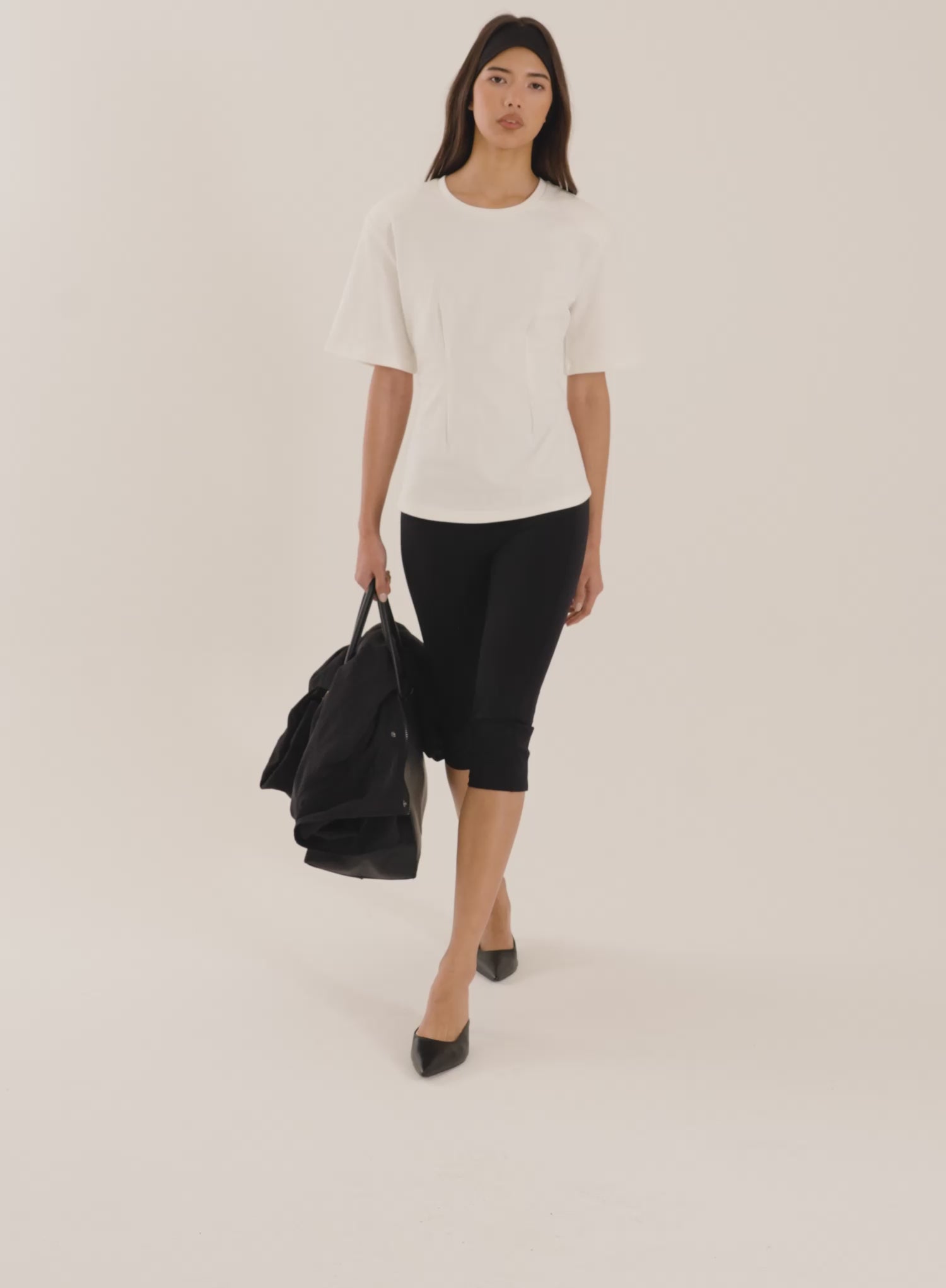 An everyday t-shirt with an elevated twist, the Isabel peplum top defines the waist to create a cinched yet easy fit. Complete with a crew-neckline and shoulder pads for a sculpted, flattering shape. For a look that radiates quiet confidence, pair with the Aliyah capri leggings along with trainers or heels.